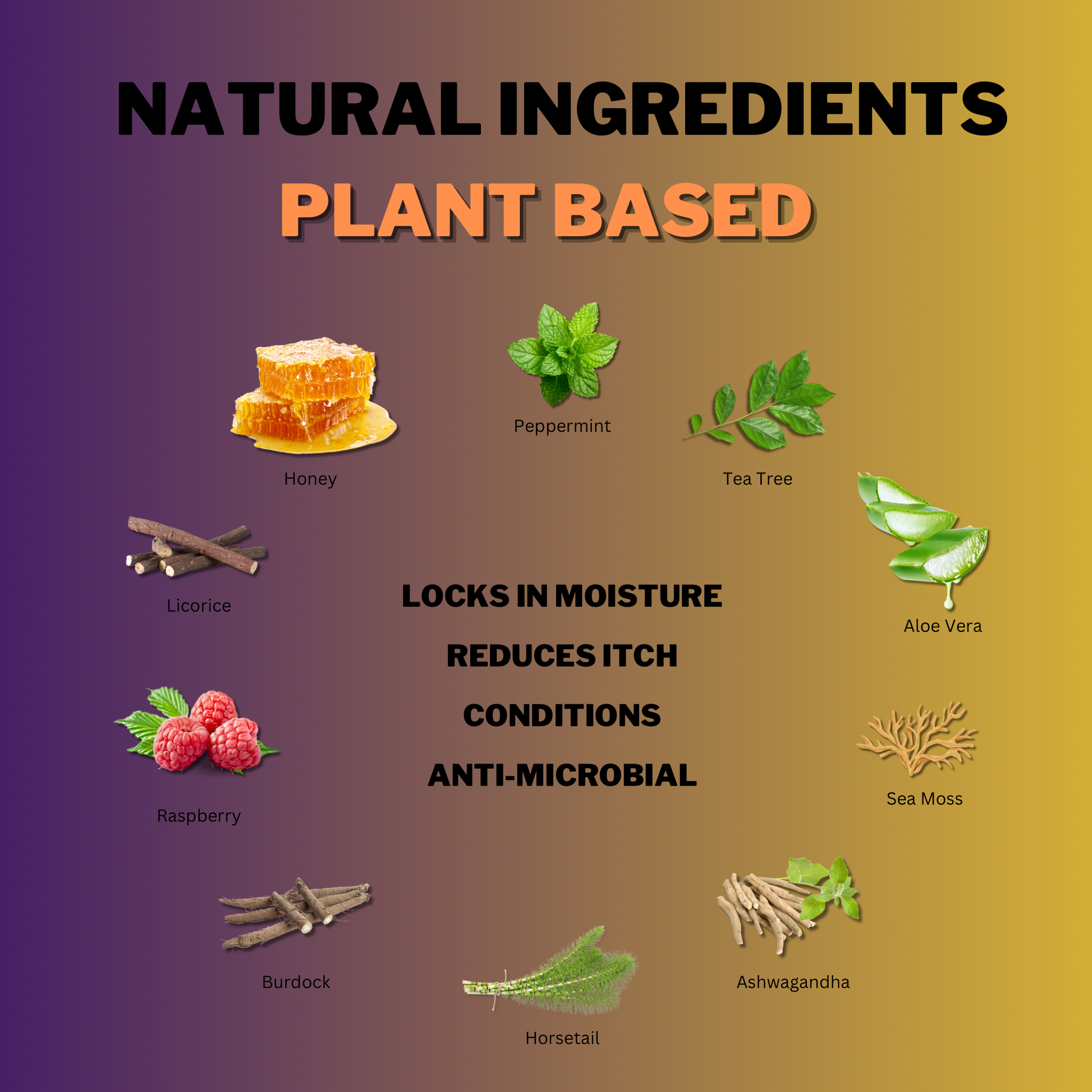 Infused with nutrient-rich sea moss extract, soothing aloe vera juice, and strengthening oils like castor oil, jojoba oil, and olive oil. Our unique natural hair spray features botanical extracts including ashwagandha root, horsetail extract for strengthening, burdock root for scalp health, raspberry extract, and licorice root extract. Raw honey acts as a natural humectant, drawing moisture from the air to keep your hair hydrated all day.